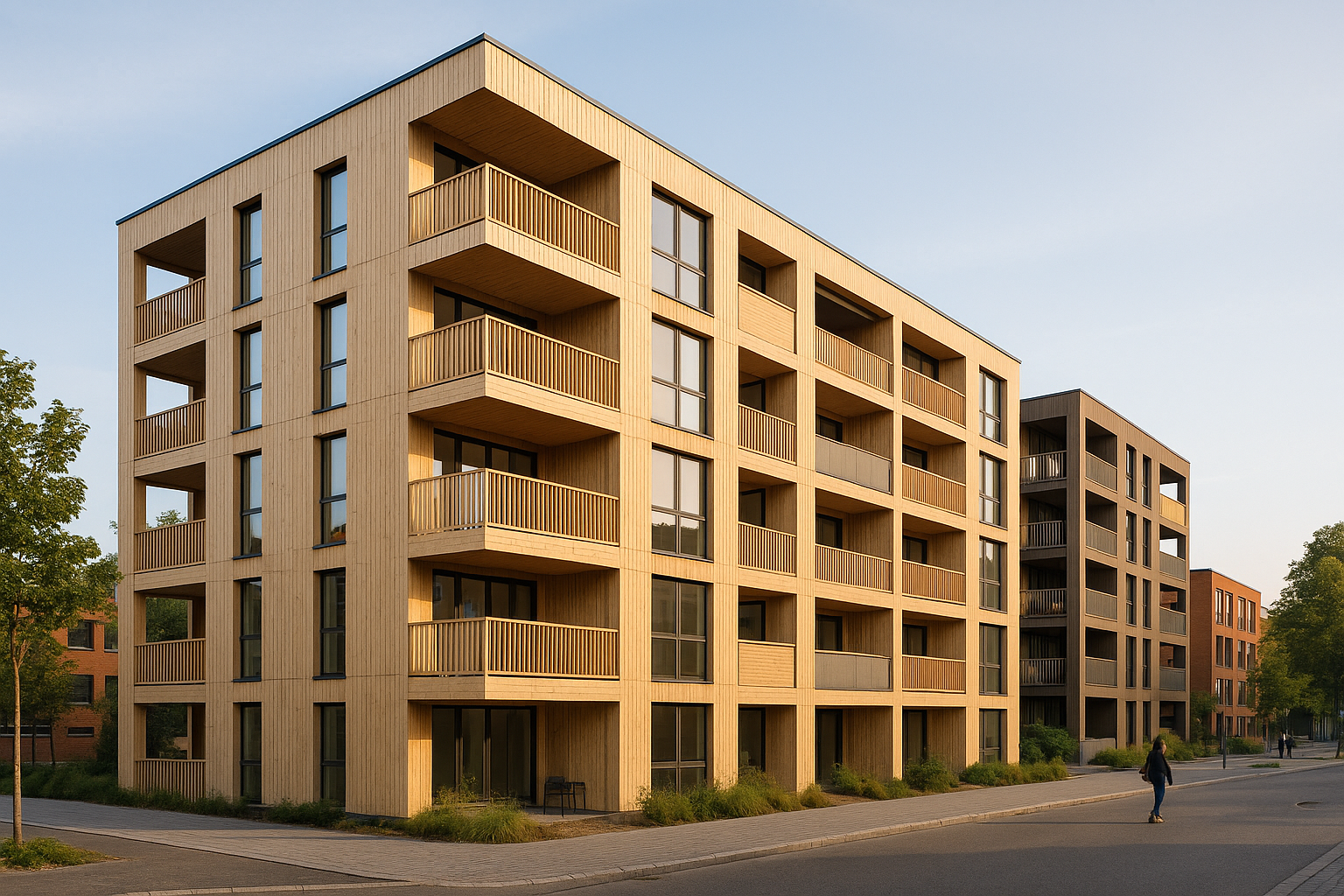 Holz bringt viel mehr als Geschwindigkeit. Holz prägt ein Wohnumfeld, das Wärme ausstrahlt und ein angenehmes Klima schafft. Auch bei der Außengestaltung öffnen sich alle Möglichkeiten. Fassaden in Holzoptik oder mit hochwertigen HPL-Platten* sind Teil einer modernen Architektursprache. Balkone und Loggien fügen sich harmonisch ein. Selbst Betonbauteile lassen sich integrieren, wenn urbane Klarheit gewünscht ist.