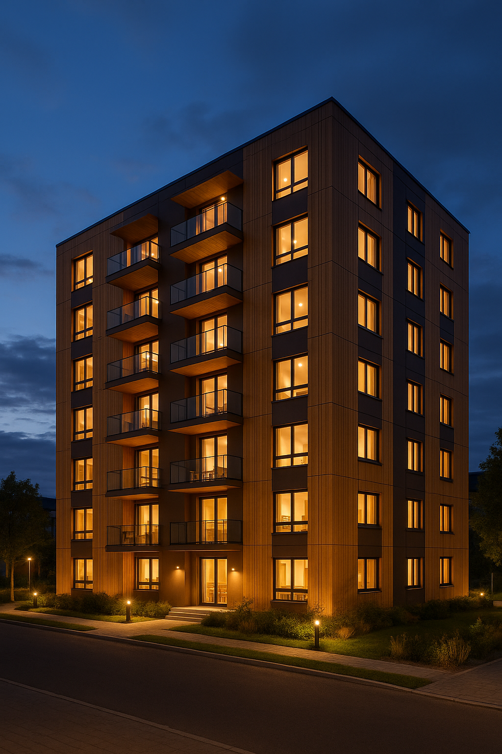 Holz bringt viel mehr als Geschwindigkeit. Holz prägt ein Wohnumfeld, das Wärme ausstrahlt und ein angenehmes Klima schafft. Auch bei der Außengestaltung öffnen sich alle Möglichkeiten. Fassaden in Holzoptik oder mit hochwertigen HPL-Platten* sind Teil einer modernen Architektursprache. Balkone und Loggien fügen sich harmonisch ein. Selbst Betonbauteile lassen sich integrieren, wenn urbane Klarheit gewünscht ist.