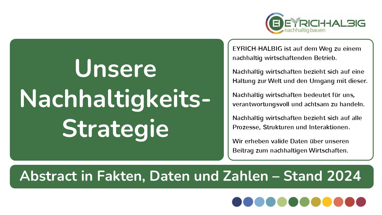 Nachhaltig wirtschaften bezieht sich auf alle Prozesse, Strukturen und Interaktionen, in die EYRICH-HALBIG mit seinem unternehmerischen Handeln eingreift und sie damit mitgestaltet. EYRICH-HALBIG ist Akteur in einer vernetzten Welt. Unser Betrieb gestaltet die Lebenswirklichkeit vieler Menschen mit.