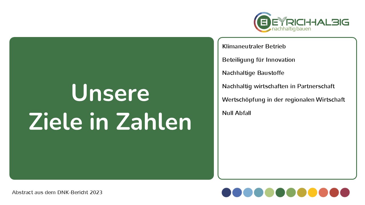 Unsere Ziele in Zahlen definieren die messbaren Größen und Zeiträume für die Zielbereiche Klimaneutraler Betrieb, Beteiligung für Innovation, Nachhaltige Baustoffe, Nachhaltig wirtschaften in Partnerschaft, Wertschöpfung in der regionalen Wirtschaft und Null Abfall.