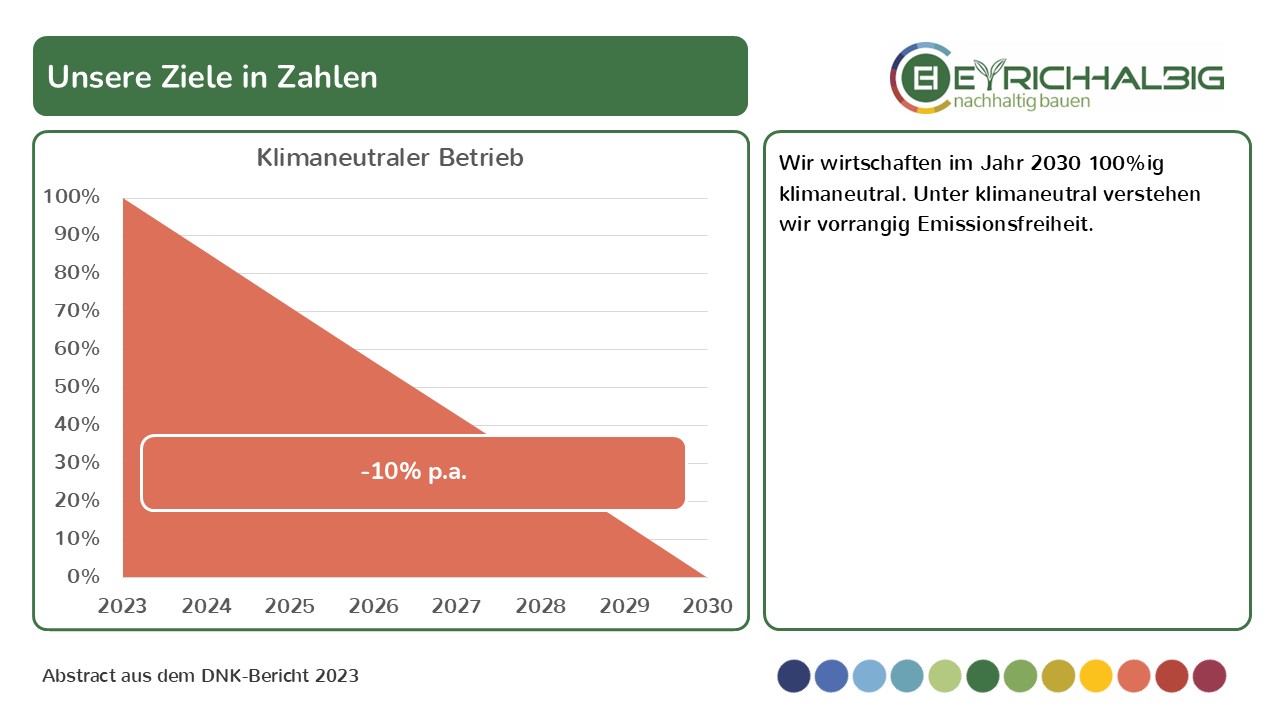 Wir wirtschaften im Jahr 2030 zu 100 Prozent klimaneutral. Unter klimaneutral verstehen wir vorrangig Emissionsfreiheit. Dazu senken wir unsere Emissionen jedes Jahr um 10 Prozent.