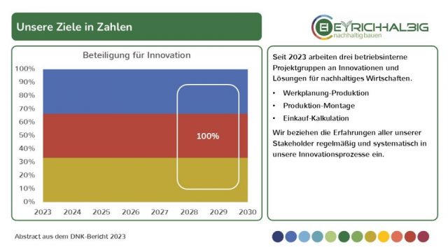 Seit 2023 arbeiten drei betriebsinterne Projektgruppen an Innovationen und Lösungen für nachhaltiges Wirtschaften. Die Gruppen arbeiten an den Nahtstellen Werkplanung-Produktion, Produktion-Montage und Einkauf-Kalkulation. Wir beziehen die Erfahrungen aller unserer Stakeholder regelmäßig und systematisch in unsere Innovationsprozesse ein.