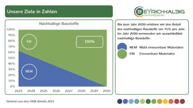 Bis zum Jahr 2030 erhöhen wir den Anteil der nachhaltigen Baustoffe um 15% pro Jahr. Im Jahr 2030 verwenden wir ausschließlich nachhaltige Baustoffe.