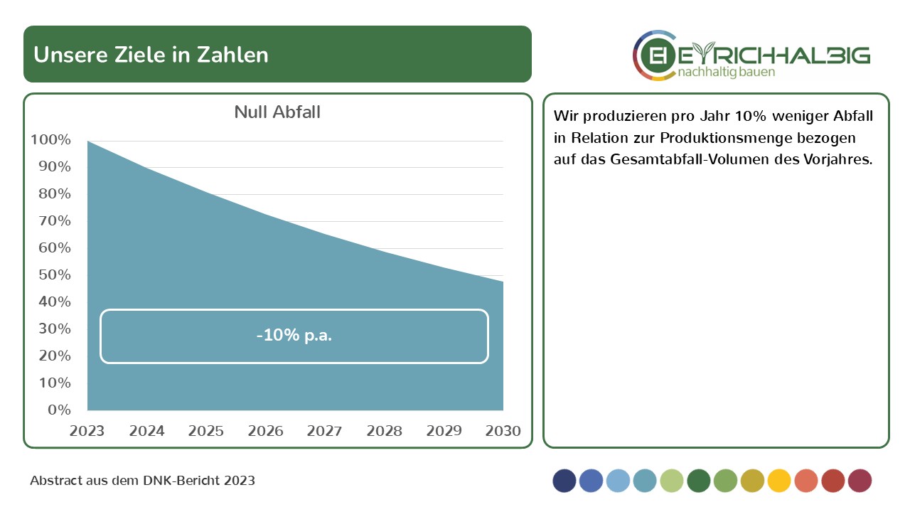 Wir produzieren pro Jahr 10% weniger Abfall in Relation zur Produktionsmenge bezogen auf das Gesamtabfall-Volumen des Vorjahres.