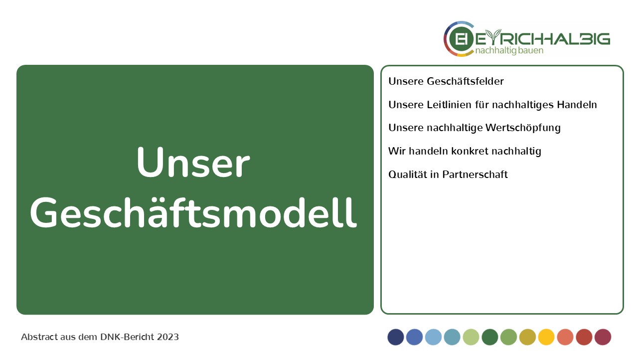 Unser Geschäftsmodell bezieht sich auf unsere drei Geschäftsfelder Privatkunden, Objektbau und Energielösungen, es gründet sich auf unsere Leitlinien für nachhaltiges Handeln, es definiert, was wir unter nachhaltiger Wertschöpfung verstehen und wie wir konkret handeln, und es bindet unsere Partner in unser qualitätvolles Handeln ein.