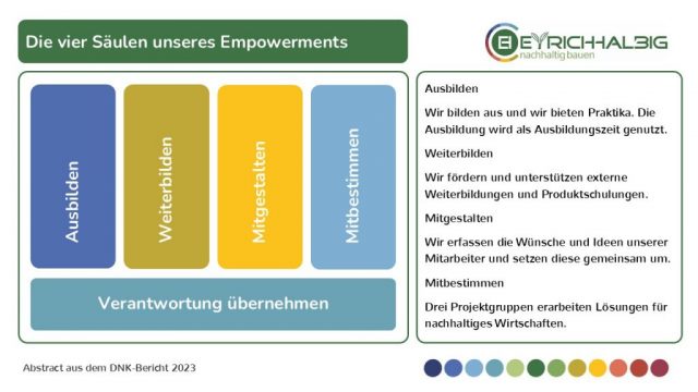 Die vier Säulen unseres Empowerments gründen sich auf dem Führungsprinzip, Verantwortung zu übernehmen. Dafür bilden wir aus und wir bieten Praktika. Die Ausbildung wird als Ausbildungszeit genutzt. Wir fördern und unterstützen externe Weiterbildungen und Produktschulungen. Wir wollen die Mitgestaltung – dafür erfassen wir die Wünsche und Ideen unserer Mitarbeiter und setzen diese gemeinsam um. Wir wollen die Mitbestimmung – drei Projektgruppen erarbeiten Lösungen für nachhaltiges Wirtschaften.