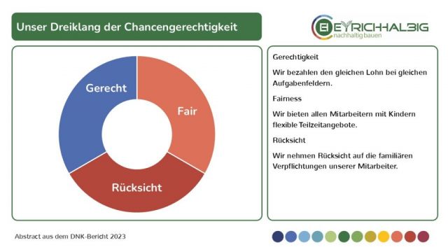Unser Dreiklang der Chancengerechtigkeit bildet sich aus der Gerechtigkeit – wir bezahlen den gleichen Lohn bei gleichen Aufgabenfeldern, der Fairness – wir bieten allen Mitarbeitern mit Kindern flexible Teilzeitangebote und der Rücksicht – wir nehmen Rücksicht auf die familiären Verpflichtungen unserer Mitarbeiter.