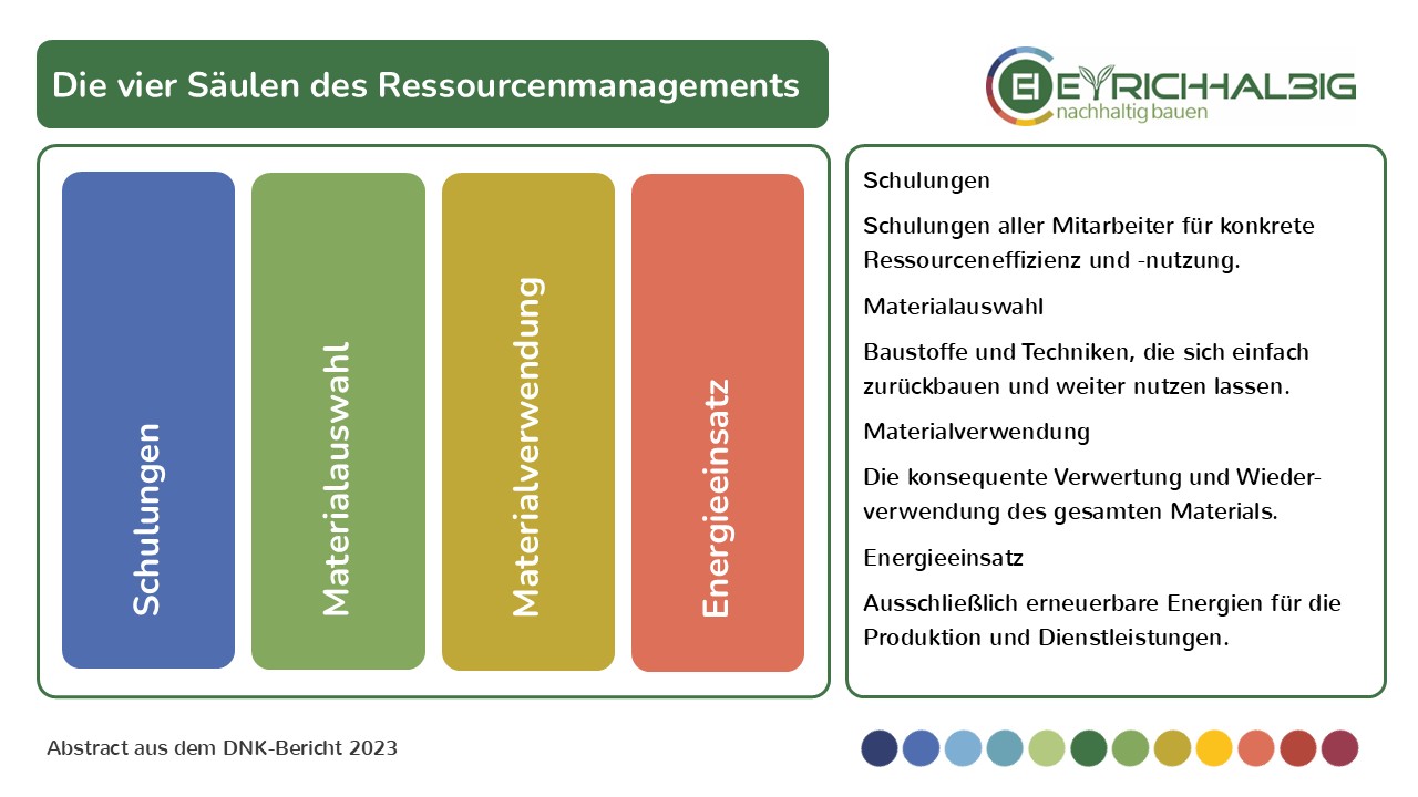 Unser Ressourcenmanagement wird von vier Säulen getragen. Wir schulen alle Mitarbeiter für konkrete Ressourceneffizienz und -nutzung. Wir wählen und nutzen Baustoffe und Techniken, die sich einfach zurückbauen und weiter nutzen lassen. Wir verwerten und wiederverwenden unser Material konsequent. Wir nutzen für unsere Produktion und unsere Dienstleistungen ausschließlich erneuerbare Energien.