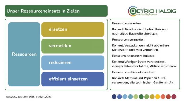 Unser Ressourceneinsatz erfolgt innerhalb der vier Ziele: Ressourcen ersetzen – konkret: Geothermie, Photovoltaik und nachhaltige Baustoffe einsetzen. Ressourcen vermeiden – konkret: Verpackungen, nicht abbaubare Kunststoffe und Müll vermeiden. Ressourceneinsatz reduzieren – konkret: weniger Strom verbrauchen, weniger Kilometer fahren, Abfälle reduzieren. Ressourcen effizient einsetzen – konkret: Material und Papier zu 100% verwenden, alle technischen Geräte mit dem Standard A+.