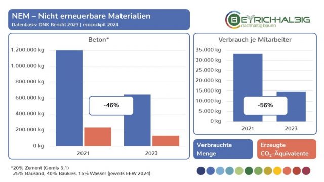 Wir reduzierten im Jahr 2023 bezogen auf das Basisjahr 2021 unseren verarbeiteten Beton – die Berechnung der C02-Äquivalente kann als sportlich bezeichnet werden und variiert je nach herangezogener Datenbank sehr – um 46 Prozent. Die Verbrauch je Mitarbeiter reduzierte sich um 56 Prozent. Für den Zement zogen wir die Datenbank Gemis 5.1 heran. Für den Bausand, Baukies und Wasser zogen wir die Datenbank EEW 2024 heran. Die Betonmischung kalkulierten auf der Grundlage Baubeton (auch hier gibt es erhebliche Schwankungen in der Mischung je nach Quelle, Absender und Datenbank).