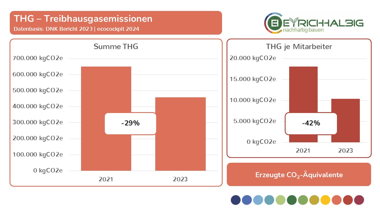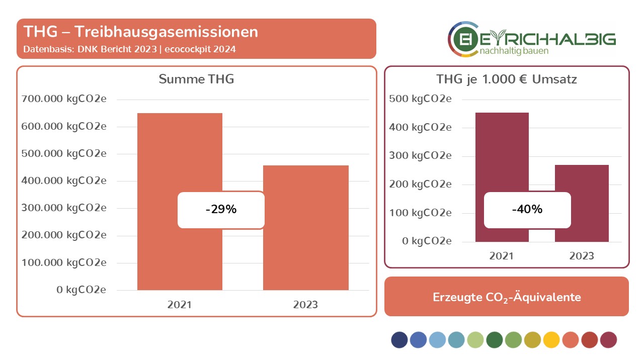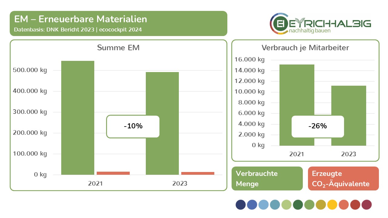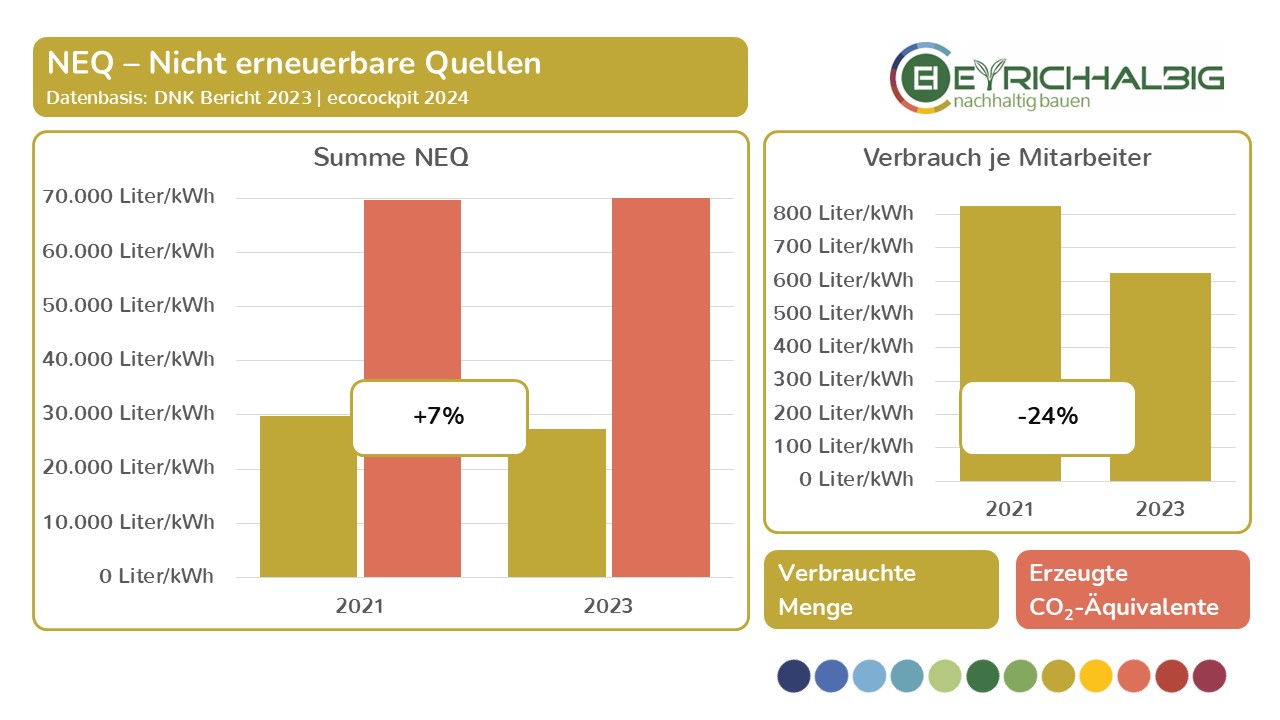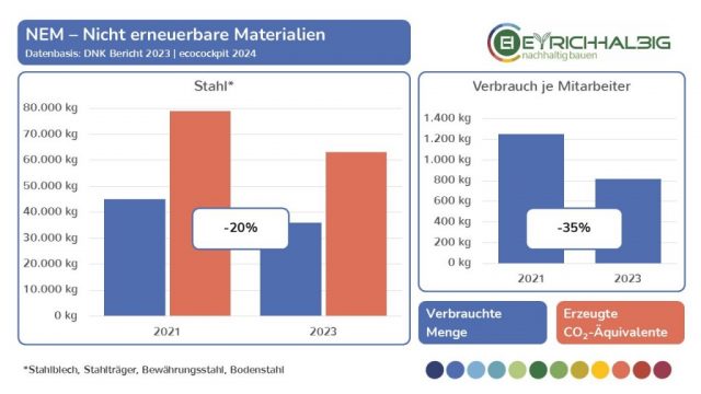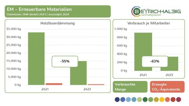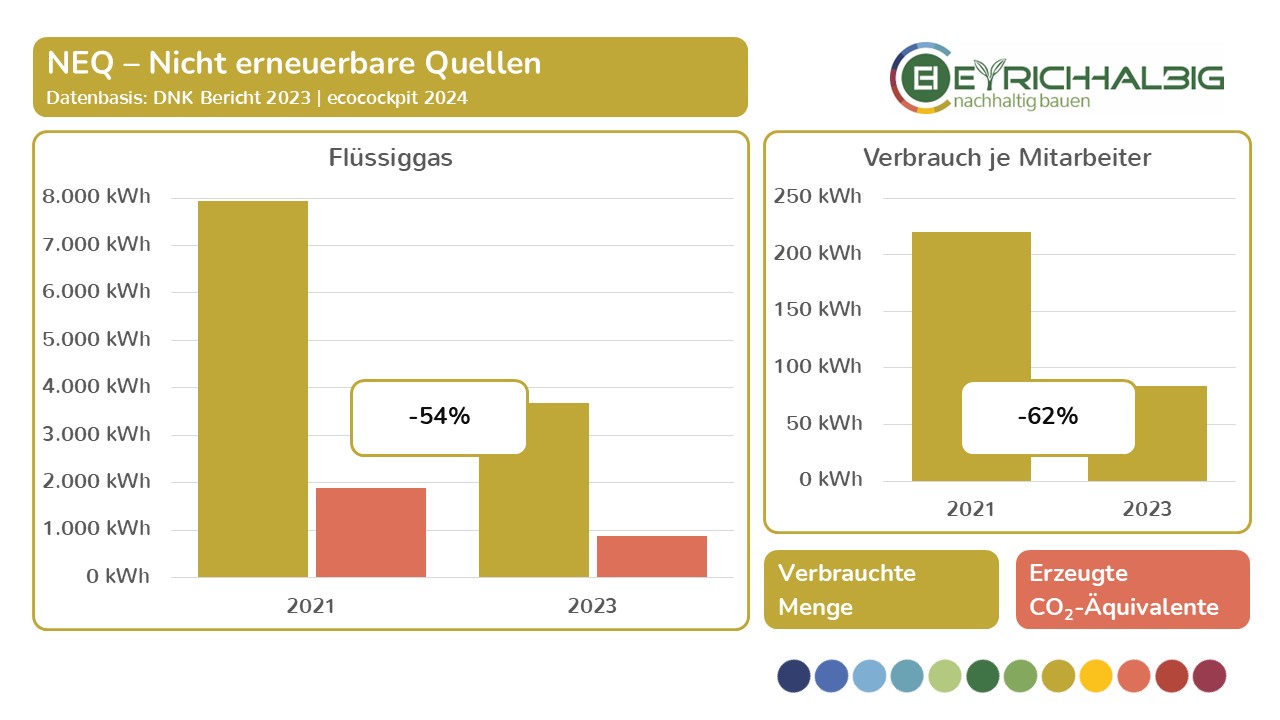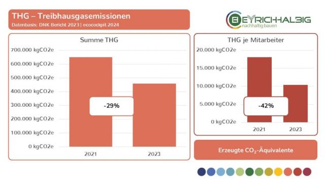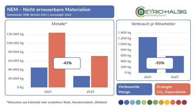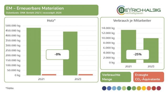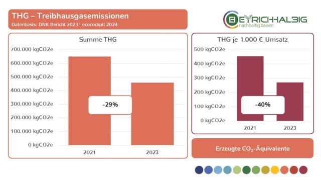 Wir messen unseren Ressourcenverbrauch in den Bereichen NEM – Nicht erneuerbare Materialien, EM – Erneuerbare Materialien und NEQ – Nicht erneuerbare Quellen in ihren Verbrauchseinheiten und den daraus resultierenden CO2-Äquivalenten. In der Summe ermitteln wir unsere THG – Treibhausgas-Emissionen und setzen diese in Beziehung zu betrieblichen Größen wie Umsatz und Anzahl der Mitarbeiter. So erfahren wir absolute und relative Zahlen, Entwicklungen und Veränderungen und können unsere Kräfte zur Verbesserung unser THG-Bilanz gezielt einsetzen. Wir haben mit unseren Messungen im Jahr 2021 begonnen und führen diese im zweijährigen Rhythmus fort. Mit dem Voranschreiten der Zeitreihe in den Folgejahren wird unser Erkenntnisgrad beständig wachsen.