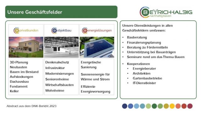 Unsere Dienstleistungen in allen drei Geschäftsfeldern umfassen die Bauberatung, die Finanzierungsplanung, die Beratung zu Fördermitteln, die Unterstützung bei Bauanträgen und Seminare rund um das Thema Bauen. Wir runden unsere Dienstleistungen ab mit Kooperationen, zum Beispiel mit Energieberatern, Architekten, Gartenbaubetrieben und IT-Dienstleistern.