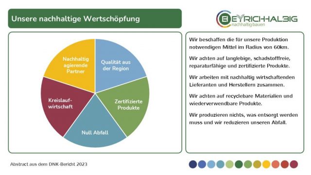 Unsere nachhaltige Wertschöpfung ist eine logische und praktische Konsequenz aus unseren Leitlinien. Wir beschaffen die für unsere Produktion notwendigen Mittel im Radius von 60km. Wir achten auf langlebige, schadstofffreie, reparaturfähige und zertifizierte Produkte. Wir arbeiten mit nachhaltig wirtschaftenden Lieferanten und Herstellern zusammen. Wir achten auf recyclebare Materialien und wiederverwendbare Produkte. Wir produzieren nichts, was entsorgt werden muss und wir reduzieren unseren Abfall.