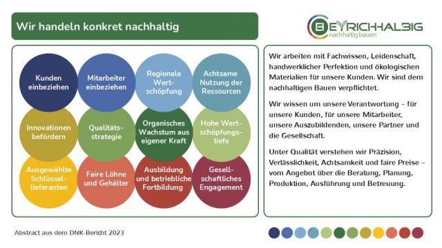 Wir streben regelmäßig die Entsprechenserklärung des DNK – Deutscher Nachhaltigkeitskodex an. Wir bringen die Nachweise für den Umwelt-Klimapakt Bayern. Wir ermitteln regelmäßig unsere Treibhausgasemissionen mit dem ecocockpit. Wir streben regelmäßig die Auszeichnung von Meisterhaft an als 5 Sterne Betrieb incl. Nachhaltigkeit und Klimaschutz. Wir sind DachKomplett-Betrieb. Wir sind ein Fachbetrieb für Dämmtechnik, Holzbau, Ausbau, Modernisierung. Wir sind Mitglied im DHV – Deutschen Holzfertigbau-Verband. Wir sind RotoProfipartner der Roto Dach- und Solartechnologie. Wir sind Träger des RAL-Gütezeichens Holzhausbau. Wir sind Verwender des Ü-Zeichens der VHT – Versuchsanstalt für Holz- und Trockenbau Darmstadt. Wir sind Partner von 81fünf. Wir sind Mitglied im Photovoltaik-Expertennetzwerk von CREATON. Wir lassen regelmäßige die Kundenzufriedenheit durch das externe Marktforschungsinstitut Anja Theßenvitz – Kommunikation & Forschung evaluieren.