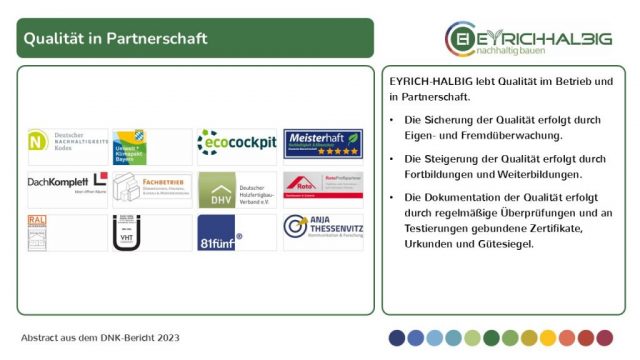 EYRICH-HALBIG lebt Qualität im Betrieb und in Partnerschaft. Die Sicherung und Steigerung der Qualität erfolgt durch Eigenüberwachung, durch Fremdüberwachung, durch Fortbildungen und Weiterbildungen, durch an regelmäßige Überprüfungen und Testierungen gebundenen Zertifikate, Urkunden und Gütesiegel.