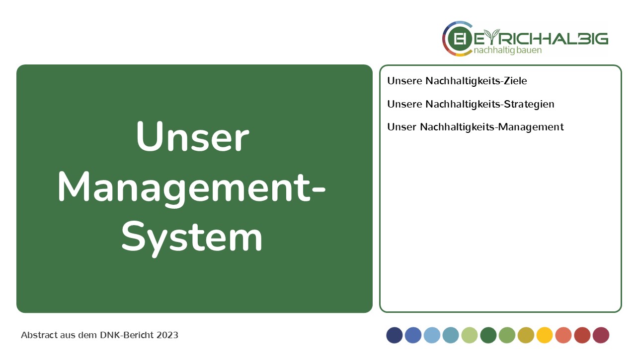Unser Management-System umfasst unsere Nachhaltigkeits-Ziele – Wo wollen wir hin?, unsere Nachhaltigkeits-Strategien – Was sind die Leitmaximen unseres täglichen Handelns? und unser Nachhaltigkeits-Management – Was setzen wir ins Werk?